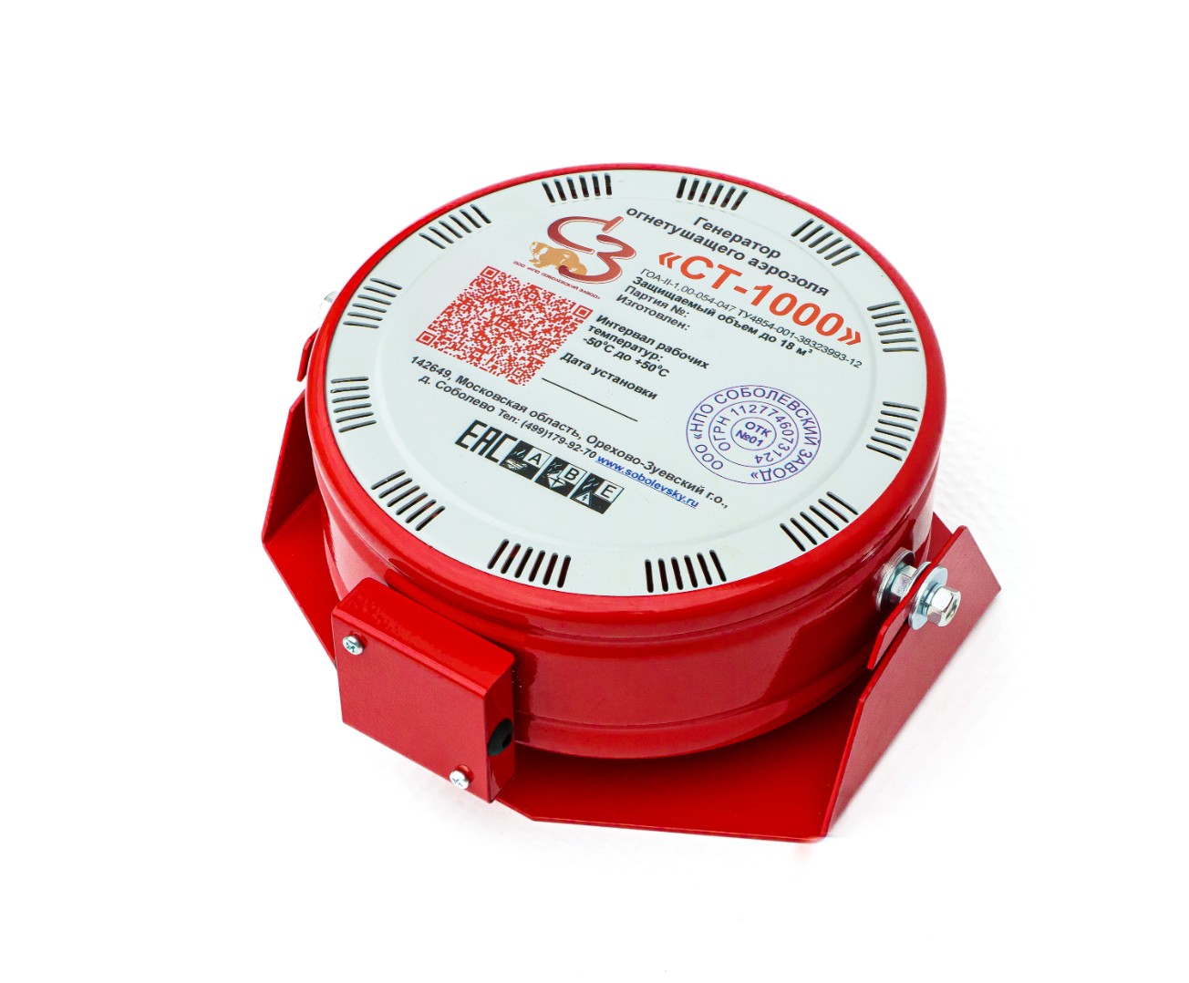 Конструкция: ГОА СТ-1000 выполнен в виде цилиндрического металлического корпуса с сопловыми отверстиями для выброса аэрозоля. Внутри корпуса расположен аэрозолеобразующий заряд и охладитель, обеспечивающий безопасную подачу аэрозоля. Снаружи генератор оснащен клеммной коробкой для подключения к пусковому устройству и кронштейном для крепления на несгораемую поверхность.
