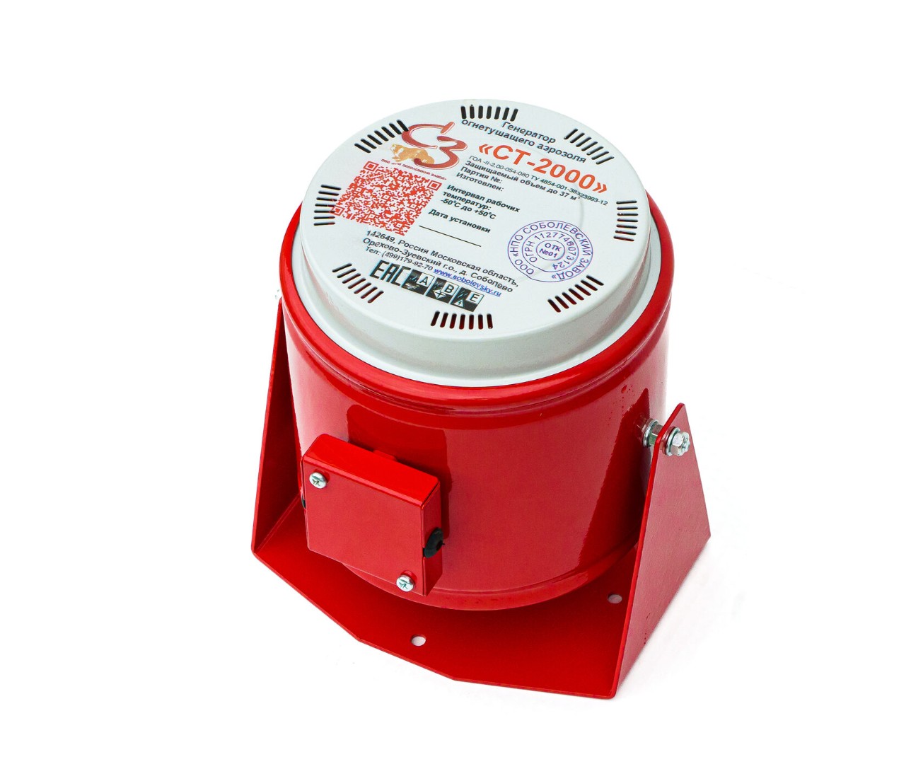 Конструкция: ГОА СТ-2000 выполнен в виде цилиндрического металлического корпуса с сопловыми отверстиями для выброса аэрозоля. Внутри корпуса расположен аэрозолеобразующий заряд и охладитель, обеспечивающий безопасную подачу аэрозоля. Снаружи генератор оснащен клеммной коробкой для подключения к пусковому устройству и кронштейном для крепления на несгораемую поверхность.