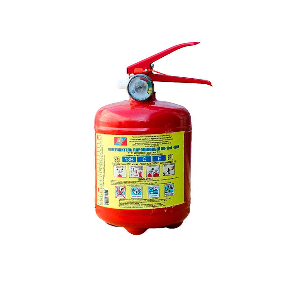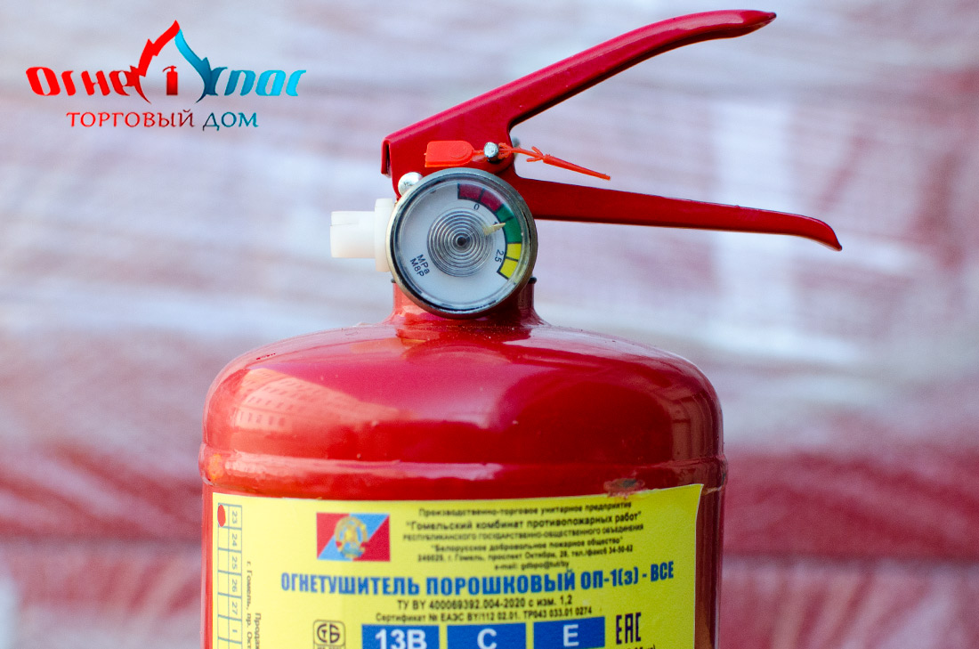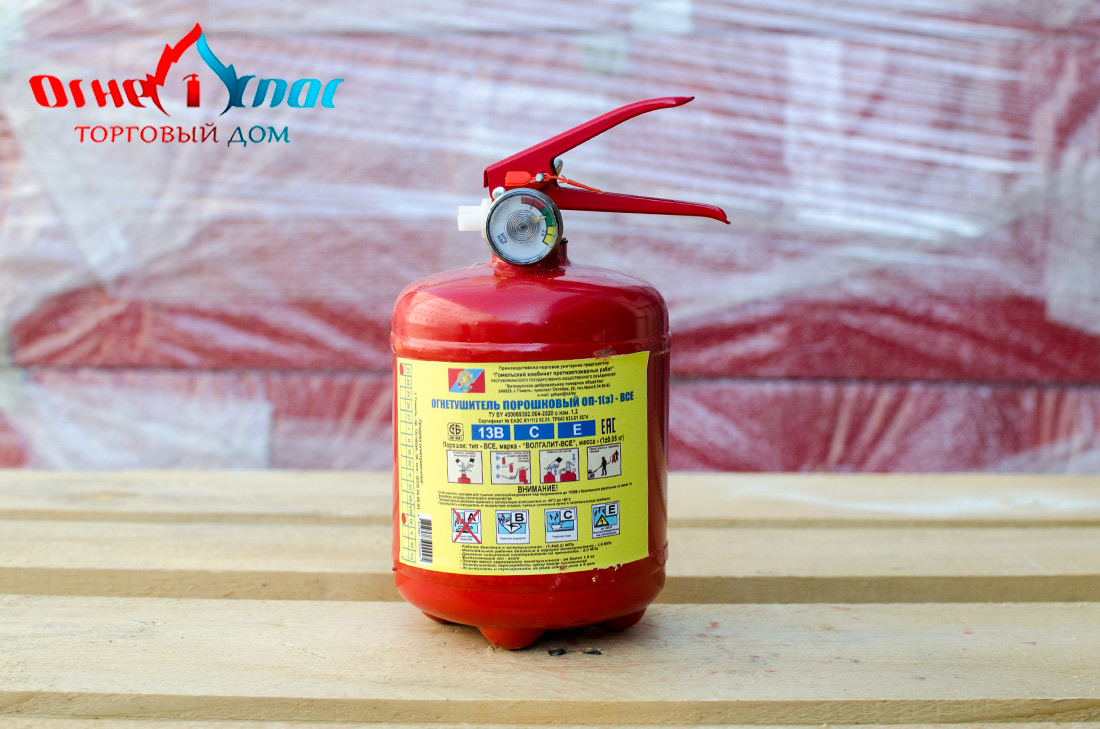 Огнетушители ОП-1 производства ПТУП «Гомельский комбинат противопожарных работ» (РБ) эффективны при тушении возгораний жидкостей, газов, нефтепродуктов, электроустановок. Широкая область применения порошковых огнетушителей ОП-1 делает их самым распространённым типом огнетушителей.