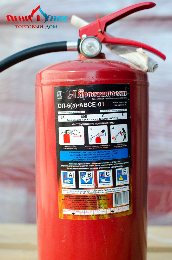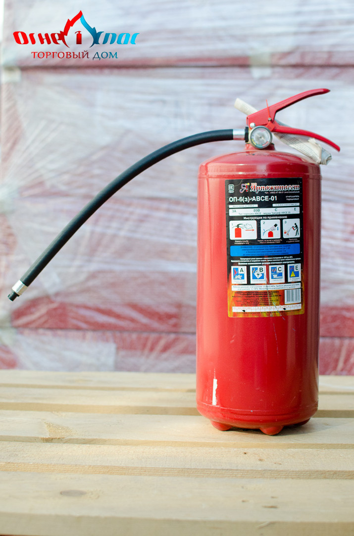 Порошковый огнетушитель ОП-6 (з) с зарядной массой 6,0±0,3 кг сертифицирован и подходит для прохождения техосмотра в РБ. Предназначен для применения на автомобильном, железнодорожном, речном транспорте, защиты помещений производственного и хозяйственного назначения, и в бытовых условиях в качестве первичных средств тушения пожаров классов А (твердых горючих веществ), В (жидких горючих веществ), С (газообразных горючих веществ) и электроустановок, находящихся под напряжением до 1000 В.
