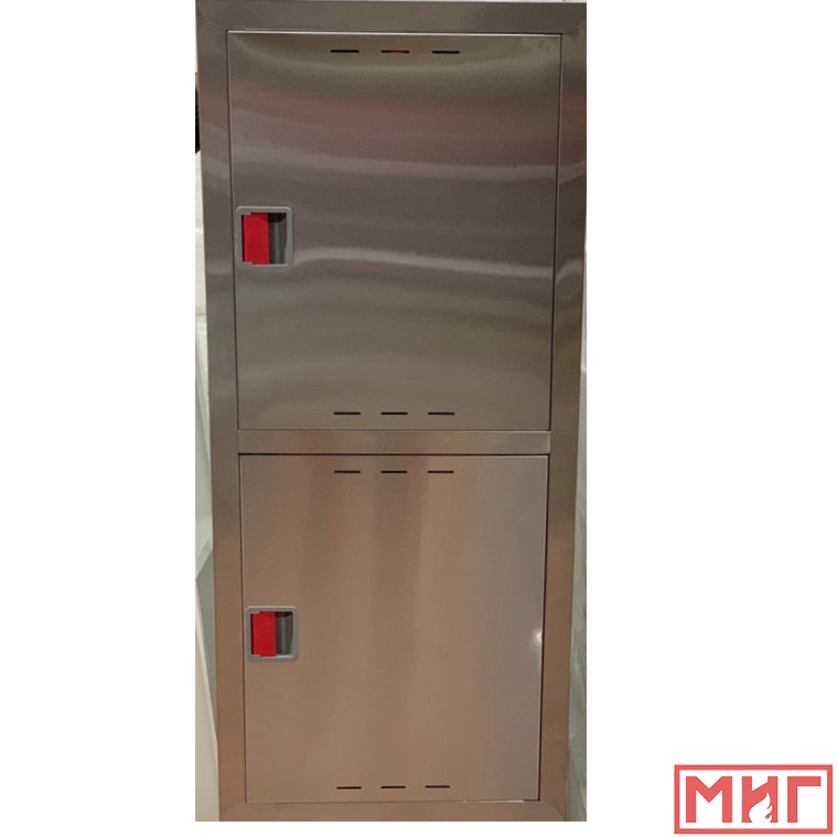 Шкаф пожарный из нержавеющей стали состоит из двух отделений – верхнего и нижнего, в которых размещаются огнетушители и корзина для размещения пожарного рукава. Дверца имеет замок, а на задней стенке расположены отверстия для крепления к стене.
